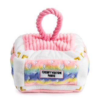 Treat your furry friend to the ultimate luxury with the Pink Ombre Chewy Vuiton Interactive Trunk - a playful and stylish parody. This interactive burrow dog toy includes three smaller toys inside for your pup to discover and play with. Watch as your furry friend enjoys hours of entertainment while digging and searching for the hidden treasures within. With its chic pink ombre design and humorous branding, the Pink Ombre Chewy Vuiton Interactive Trunk is a must-have for any fashion-forward and playful pup.