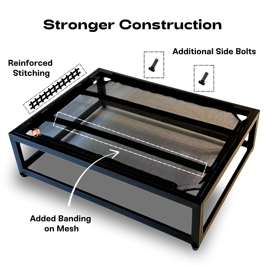 This raised dog bed features a sturdy metal base and chew-resistant platform 8 inches off the floor—perfect for small and large dogs alike. This elevated dog bed allows for airflow and provides a perfect solution for pups that have a penchant for puncturing.