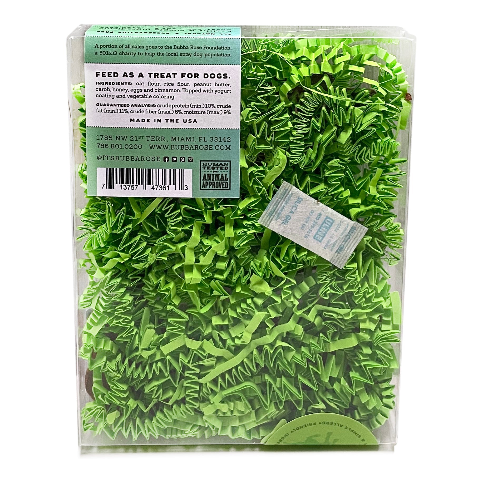 Ingredients: oat flour, rice flour, peanut butter, eggs, honey and cinnamon. Topped with yogurt coating (yogurt powder, non fat milk powder, modified tapioca starch, egg whites, tapioca maltodextrin, apple pectin, potato starch), vegetable coloring and carob.